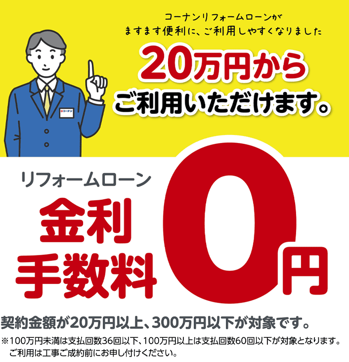 コーナンリフォームでは、リフォーム費用の金利手数料をコーナンが負担する「金利手数料0円」のローンを選択できるのが大きな魅力です。
