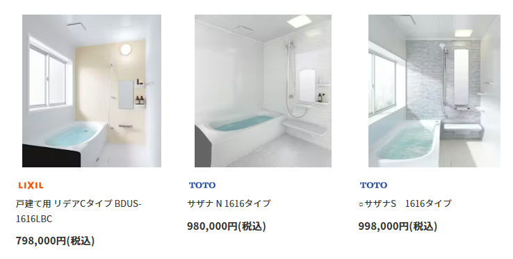TOTOやLIXILの浴室商品を取り扱っており、工事・処分費込みの価格は77万円台から240万円台までと、サイズやグレードによって幅があります。