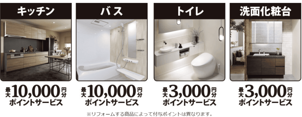 商品によって付与されるポイントは異なりますが、キッチン・バスは最大1万円分、トイレ・洗面台は最大3000円分付与されます。