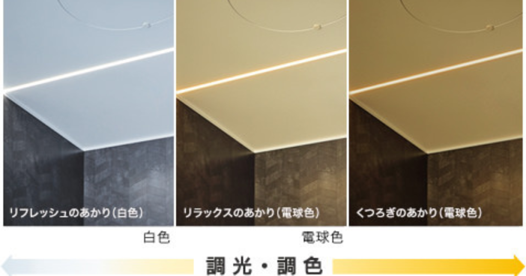 特に人気なのが「フラットラインLED照明」です。一般的な丸い電球ではなく、天井に埋め込まれた線状のあかりなので、見た目がすっきりして掃除もラクになります。