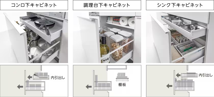 また、本プランには内引出しもついているため、キッチンで使う小物類の収納にも長けています。