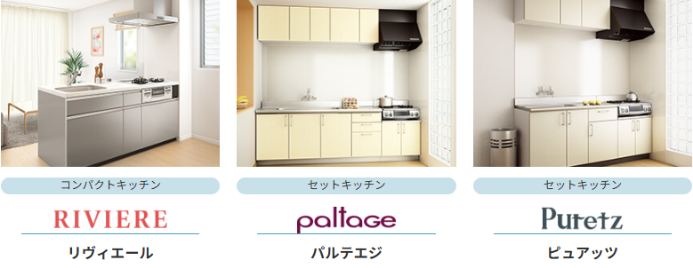 前述の主力のシステムキッチン3製品の他に、賃貸向けのコンパクトキッチンが1種類、セクショナルキッチン(在来キッチン)が2種類あります。