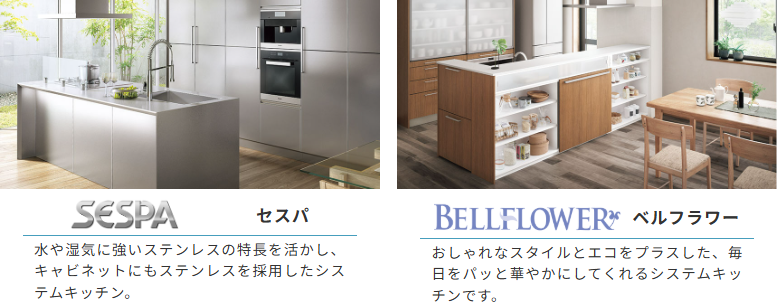 高品質なオールステンレスの「セスパ」、リーズナブルな価格の「ベルフラワー」の3製品が主力です。詳しくはナスラックのシステムキッチンは2種類をご覧ください。
