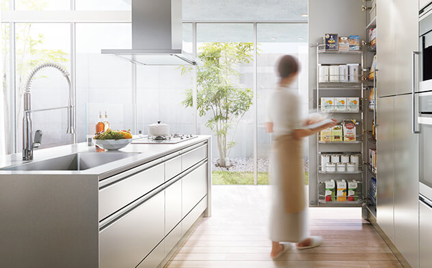 ワークトップはもちろん、シリーズによってはキャビネット内部までステンレス仕様にでき、湿気やカビ、油汚れ、腐食に強い構造を実現。