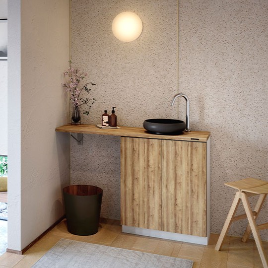 コンパクト手洗い」は奥行き30cm、標準仕様は洗面ボウルのみと、シンプルな洗面台です。洗面所ではなく、玄関や趣味スペースなどの部屋に設置する、セカンド洗面台として使用するのがおすすめです。