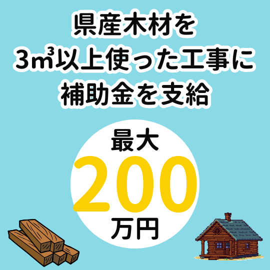 | 県産木材を3㎥以上使用した木造施設等の整備 | 最大50万円(延床面積平方メートルあたり2,000円) |